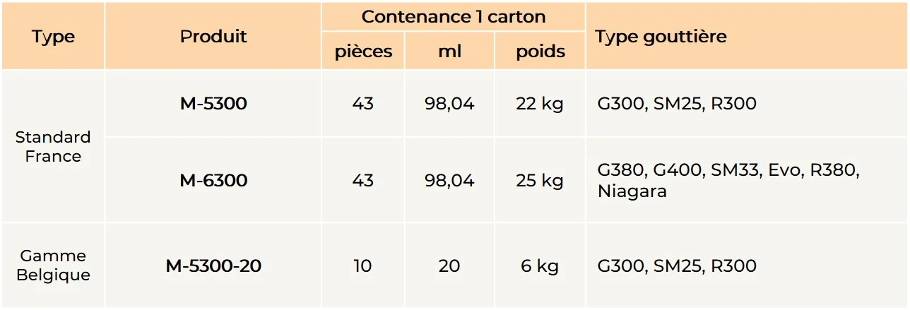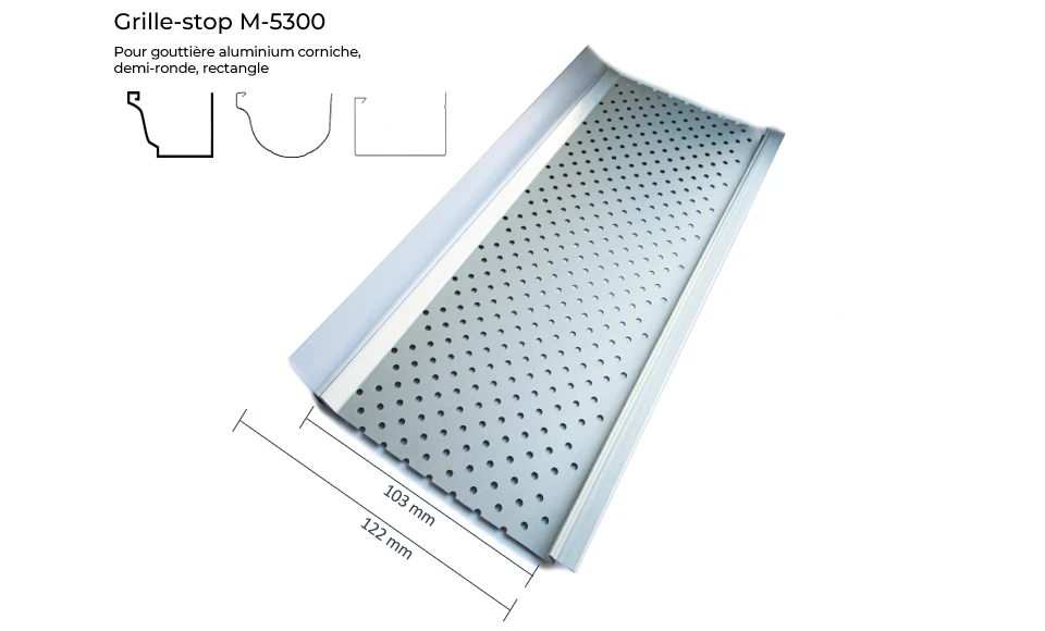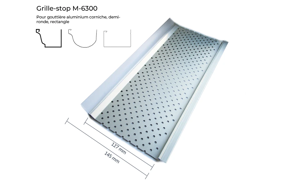 - Compatibilité : s’installe sur des gouttières aluminium G300, SM25, R300 ou G380, G400, SM33, Evo, R380, Niagara, demi-rondes, carrées ou corniches