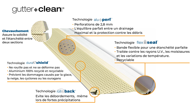 Le Gutter Clean se positionne comme un filtre pour gouttière de nouvelle génération. Il combine une grille de protection anti-feuilles, une grille de gouttière en aluminium recyclable, et un système de fixation robuste, garantissant une protection durable des installations existantes.