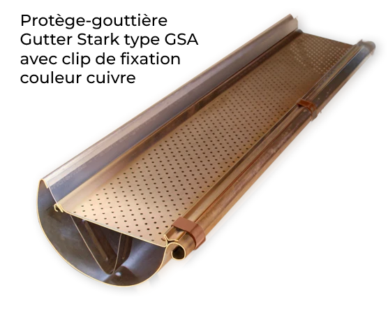 Le système Gutter Stark Cuivre est une grille de protection gouttière haut de gamme, adaptée aux gouttières demi-rondes en cuivre. Fabriquée en aluminium avec revêtement anodisé teinte cuivre, cette grille pare-feuilles limite l’accumulation des débris végétaux dans les chéneaux, tout en s’intégrant parfaitement aux installations existantes en cuivre.