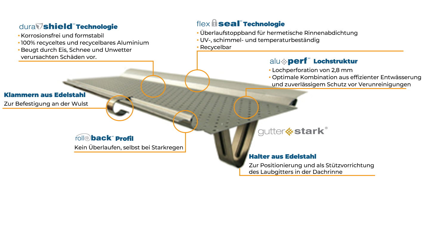 Technische Merkmale des Gutter Stark Laubschutzsystems