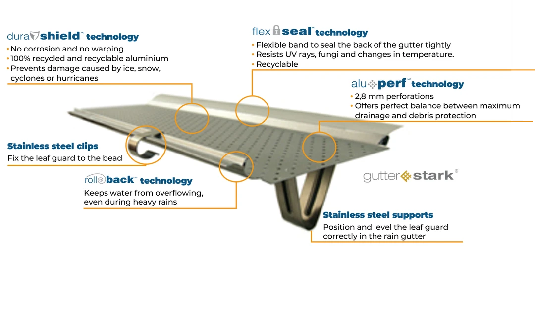 The Gutter Stark GSA model is compatible with half-round and box gutters and is especially suited for premium installations requiring reliable gutter leaf guard performance without compromising on aesthetics.